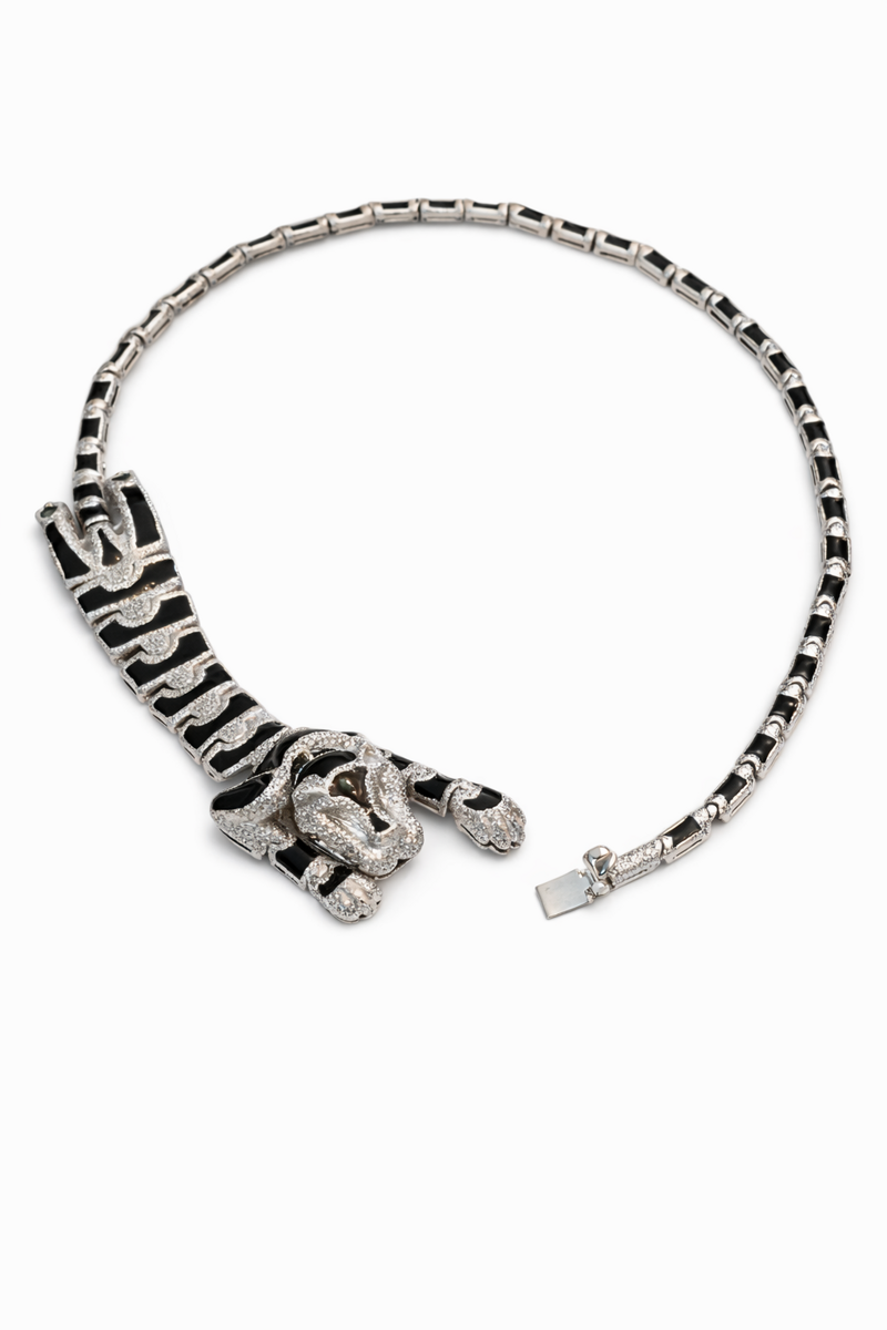 Art 001/2 collier tigre smalto intero in bronzo bagnato in giallo/bianco/e rutenio smaltato a mano e con occhi di smeraldi, di circa gr. 65